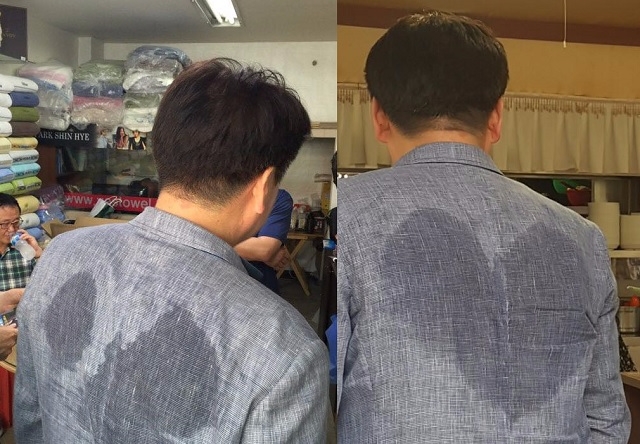 이미지 확대보기이 사진을 보면 기 의원의 겉옷 등쪽 부분은 땀으로 ‘하트 모양’이 새겨졌다. 기 의원은 이 현상을 지역구에 대한 사랑이라고 표현했다.
