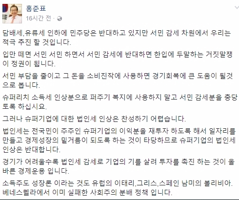 특히 홍준표 대표는 "서민 부담을 줄이고 그 돈을 소비진작에 사용하면 경기회복에 큰 도움이 될것으로 봅니다"라며 "슈퍼리치 소득세 인상분으로 퍼주기 복지에 사용하지 말고 서민 감세분을 충당토록 하십시요"라고 말하면서도 "슈퍼기업에 대한 법인세 인상은 찬성하기 어렵다"고 밝혔다.
