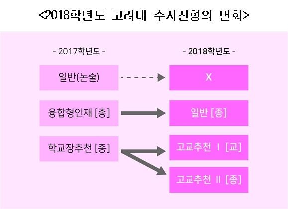 고려대는 2018학년도 전형계획을 수립하면서 ‘논술전형’ 폐지라는 초강수를 뒀다. 이에 따라 학생부전형의 인원을 확대하고 1개의 ‘학생부종합전형’을 더 신설해 학생부 위주 전형을 중심으로 한 수시전형을 설계했다.
