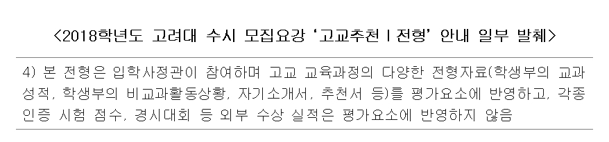 같은 추천전형임에도 두 전형은 교과와 서류 중심이라는 명확한 차이를 보인다. 고교추천Ⅰ전형은 학생부 교과를 100%로 반영하기 때문에 이 전형을 ‘학생부교과전형’으로 보는 경향이 강하다. 하지만 수시 모집요강을 살펴보면 전형에 대해 아래와 같이 안내하고 있다.
