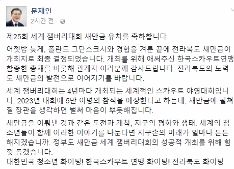 또한 문재인 대통령은 이날 자신의 페이스북 글을 통해 "제25회 세계 잼버리대회 새만금 유치를 축하합니다"라며 "대회 유치를 위해 애써주신 한국스카우트연맹을 비롯해 관계자 여러분께 감사드리며 전라북도의 노력도 새만금의 발전으로 이어지기를 바랍니다"라고 밝혔다.