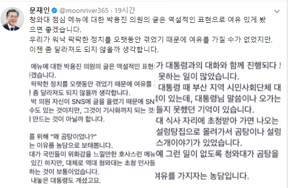 이에 문재인 대통령은 자신의 페이스북을 통해 "박용진 의원 자신이 소셜미디어에 글을 올렸기 때문에 (소셜미디어상에선) 티격태격할 수도 있는 것이지만, 그것이 기사화까지 되는 것은 우리 정치를 너무 잘게 만드는 것이 아닐까 한다"고 덧붙였다.