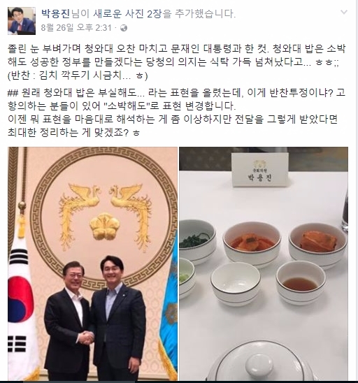 이미지 확대보기박용진 의원은 지난 26일 당정청 청와대 오찬 후 자신의 페이스북에 음식 사진과 함께 "청와대 밥은 부실해도 성공한 정부를 만들겠다는 당·청 의지는 넘쳐났다"는 글을 게재했다.