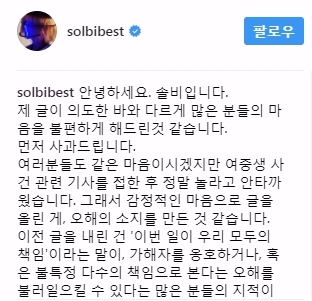 솔비도 사과문에서 언급했다시피 솔비가 가해자를 옹호하거나 책임을 돌리려는 목적으로 쓴 글일 가능성은 높지 않다. 그럼에도 불구하고 대중의 관심을 받는 연예인이 사건에 대한 개인의 해석을 올리다보니 날카로운 비판 도마에 오를 수밖에 없는 것이다.