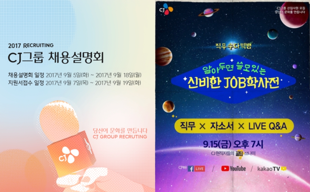 CJ는 지난 5일부터 18일까지 전국 대학을 순회하며 채용설명회를 진행하며 15일 오후 7시부터는 페이스북 라이브, 유튜브, 카카오TV 등을 통해 직무에 관해 실무자들이 대화를 나누고 실시간으로 질문에 답변해주는 ‘알아두면 쓸모있는 신비한 JOB학사전’을 방송한다.