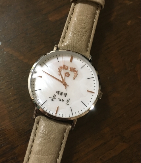 지난 8월 10일 공개된 ‘문재인 시계’는 윗부분에 봉황을 아랫부분엔 문재인 대통령의 친필 사인이 새겨져있다. 가죽끈은 밝은 회색을 띄고 있어 기품이 있다.
