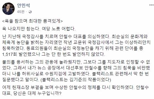 안민석 의원은 “욕 나오지만 참는다. 여당 노릇 어렵다”며 “난 지난해 국정감사를 치르며 안철수 대표를 의심했다. 최순실의 문화계와 체육계 농단을 밝히는 자리였던 작년 교문위 국정감사에서 그는 이상하리만치 침묵했다. 동료의원들이 최순실의 국정농단을 캐기 위해 총 관련 단어를 총 1517회 발언했으나 그는 단 한 번도 발언하지 않았다”고 밝혔다.