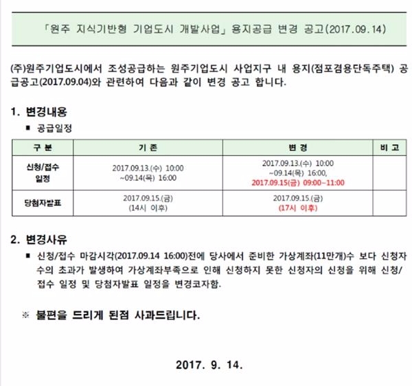 이미지 확대보기(주)원주기업도시는 “국민들의 뜨거운 관심으로 신청폭수가 이날 오후 4시 전에 준비한 가상계좌 11만개수 보다 신청수가 예상보다 많아 마감일자를 변경했다”고 공지했다.
