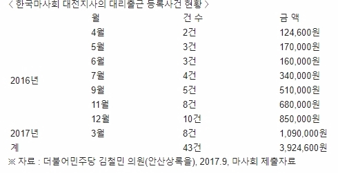 이 같이 마사회가 제출한 국정감사 자료에 따르면 대전문화공감센터에서 근무하며 시간제 경마직 질서반장을 맡고 있던 A씨는 결근한 PA들의 출근 등록을 대신 해주고 회사에서 지급된 급여를 자신의 개인계좌로 몰래 부정하게 입금 받은 것으로 나타났다.