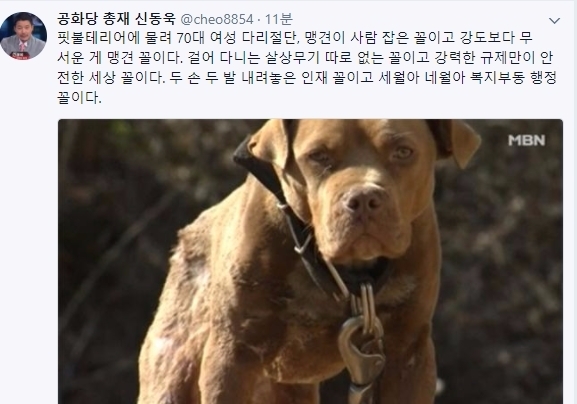 이에 신동욱 총재는 "핏불테리어에 물려 70대 여성 다리절단, 맹견이 사람 잡은 꼴이고 강도보다 무서운 게 맹견 꼴이다"라며 "걸어 다니는 살상무기 따로 없는 꼴이고 강력한 규제만이 안전한 세상 꼴이다"라고 트위터 글을 통해 꼬집었다.