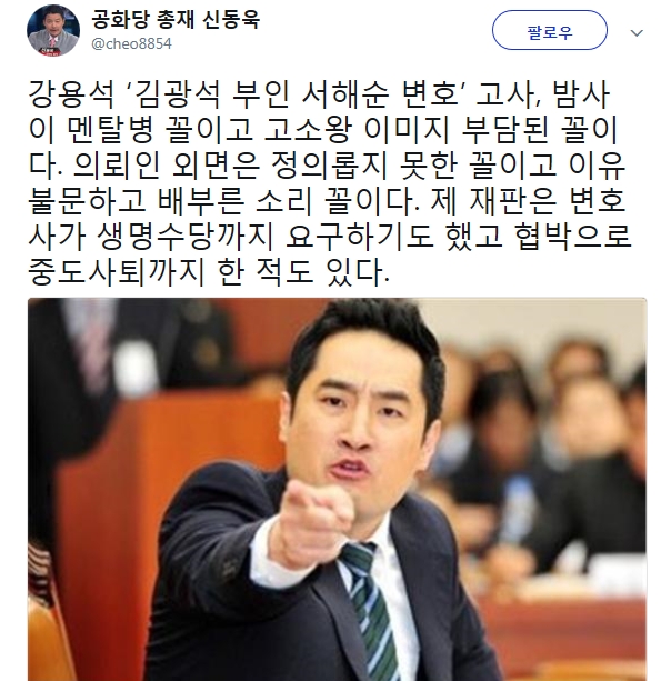 이에 신동욱 총재는 25일 "강용석 ‘김광석 부인 서해순 변호’ 고사, 밤사이 멘탈병 꼴이고 고소왕 이미지 부담된 꼴이다"라며 "의뢰인 외면은 정의롭지 못한 꼴이고 이유 불문하고 배부른 소리 꼴이다. 제 재판은 변호사가 생명수당까지 요구하기도 했고 협박으로 중도사퇴까지 한 적도 있다"라고 꼬집었다.