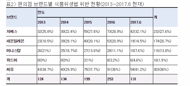 이미지 확대보기29일 더불어민주당 기동민 의원(서울 성북을, 국회 보건복지위원회)이 식품의약품안전처로부터 받은 ‘편의점 프랜차이즈 식품위생법 위반 현황 자료’에 따르면 씨유, 지에스, 세븐일레븐, 미니스톱, 위드미 등 편의점 업체들의 위반 건수는 2013년 124건에서 지난해 253건으로 급증한 것으로 나타났다.