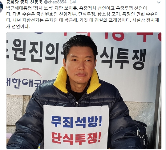 신동욱 공화당 총재는 17일 자신의 트위터에 "박근혜대통령 '정치 보복' 재판 보이콧, 옥중정치 선언이고 옥중투쟁 선언이다"고 주장했다./신동욱sns