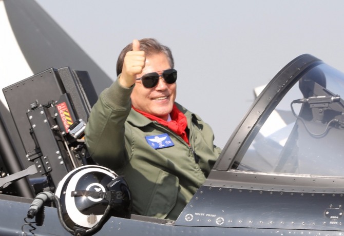 이미지 확대보기문재인 대통령이 17일 오전 경기도 성남 서울공항에서 열린 '서울 국제항공우주 및 방위산업 전시회(서울 ADEX) 2017' 개막식에 참석해 블랙이글스 T-50 1호기에 올라 엄지손가락을 들어보이고 있다. 사진=뉴시스 문재인 대통령이 독자적인 항공우주산업과 방위산업육성의 필요성을 언급했다. 이를 위해 문재인 대통령은 방위산업 역량 확보를 위한 방산관계자의 역할을 강조했다.