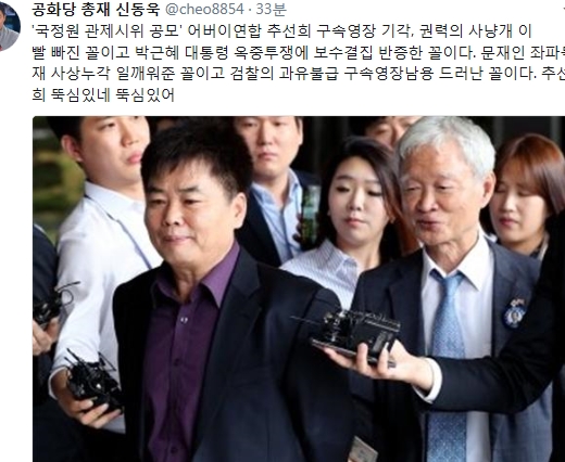 그는 이어 "문재인 좌파독재 사상누각 일깨워준 꼴이고 검찰의 과유불급 구속영장남용 드러난 꼴이다. 추선희 뚝심있네 뚝심있어'라고 덧붙였다.