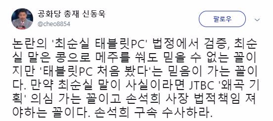 신 총재는 “최순실 말은 콩으로 메주를 쒀도 믿을 수 없는 꼴이지만 '태블릿PC 처음 봤다'는 믿음이 가는 꼴이다”라고 생각을 밝혔다. 이어 “최순실 말이 사실이라면 JTBC '왜곡 기획' 의심 가는 꼴이고 손석희 사장 법적책임 져야하는 꼴”이라고 덧붙였다.