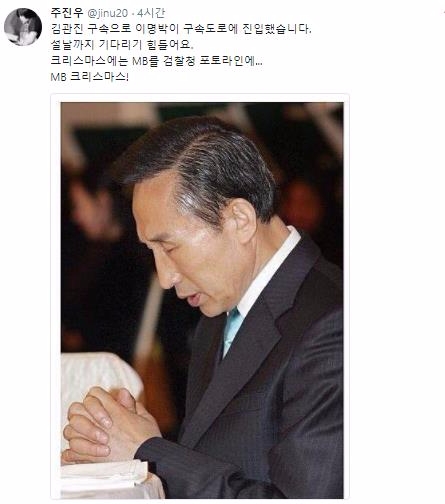 주 기자는 11일 자신의 트위터에 “김관진 구속으로 이명박이 구속도로에 진입했다”고 글을 시작했다. 이어 “설날까지 기다리기 힘들어요”라며 “크리스마스에는 MB를 검찰청 포토라인에”라고 덧붙였다.