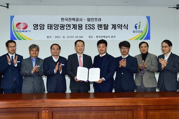 이미지 확대보기한국전력이 탑인프라와 15일 한전 본사에서 태양광연계용 대용량 ESS 렌탈 계약을 체결했다고 16일 밝혔다.