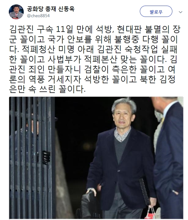 이어"적폐청산 미명 아래 김관진 숙청작업 실패한 꼴이고 사법부가 적폐본산 맞는 꼴이다. 김관진 죄인 만들자니 검찰이 측은한 꼴이고 여론의 역풍 거세지자 석방한 꼴이고 북한 김정은만 속 쓰린 꼴이다"고 덧붙였다.