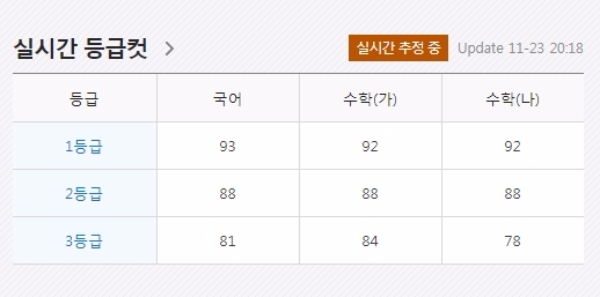 메가스터디의 경우 특허받은 등급컷 분석시스템에 따르면 23일 20시 18분 현재 1등급(원점수 기준)은 국어 93점, 수학(가) 92점, 수학(나)92점, 영어 90점, 한국사 40점이다.