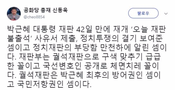 신 총재는 "재판부는 궐석재판으로 구색 맞추기 급급한 꼴이고 국선변호인 공개로 체면치레 꼴"이라며 "궐석재판은 박근혜 최후의 방어권인 셈이고 국민저항권인 셈"이라고 끝맺었다.
