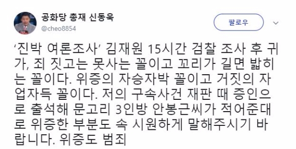 신동욱 공화당 총재는 김 의원에 대해 자신의 트위터에 김 의원 ‘진박 여론조사’에 대한 글을 남겼다. 신 총재는 “죄 짓고는 못사는 꼴이고 꼬리가 길면 밟히는 꼴”이라며 “위증의 자승자박 꼴이고 거짓의 자업자득”이라고 논평했다.
