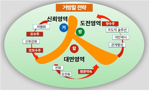 '거방할 전략'은 '거클'을 유지하고 '방클'을 거래화 하고, '할클'의 방문을 통해 사업의 기회를 마련하는 것이다. 작년 대비 거클의 변화는 있었는지? 핵심 거클의 수준은 어떠한지? 작년대비 방클의 수는 어느 정도 늘어났는지? 방클의 질적 수준은 어떠한지? 작년 대비 여전히 할클로만 머물고 있는 고객사 중 반드시 방문했어야 했던 할클은 어디인지? 이러한 기본적인 데이터 분석만으로도 그 핵심적인 문제점을 찾아 낼 수 있을 뿐만 아니라, 구체적이 대안을 찾아 낼 수 있다.