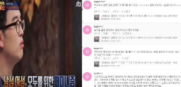 또 다른 시청자는 이와 반대 의견을 피력했다. 그는 “방송의 취지는 큰 틀에서 남녀 간 평등을 외치는 것”이라고 일침을 가했다. 그러면서 “오늘날 우리사회 페미니즘의 방법론에 일부 문제를 삼을 수는 있겠으나, 페미니즘 자체를 부정하는 남성들의 태도는 도통 이해할 수 없다”며 이날 방송을 부정적으로 평가한 시청자들 논리에 반박했다.