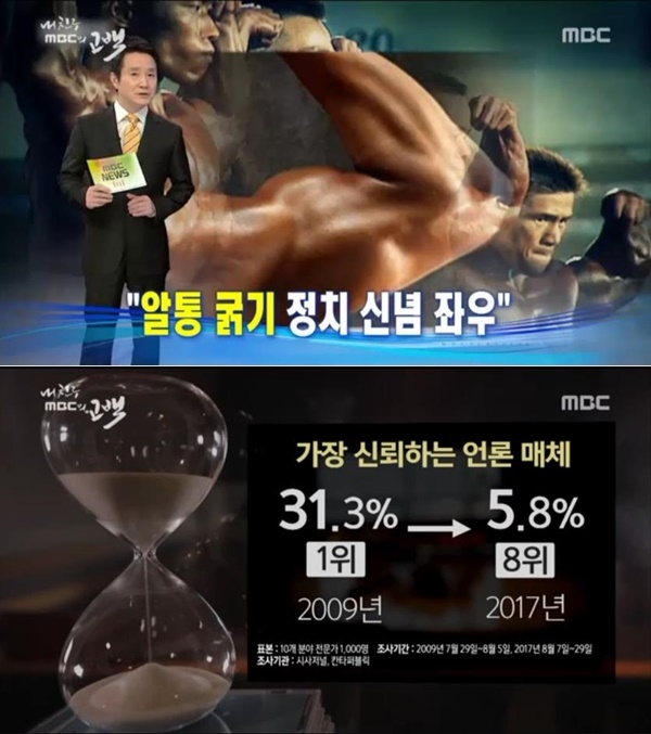 MBC는 ‘보수·진보 체질 따로 있나?’라는 보도를 하기도 했다. 스튜디오에 선 아나운서는 “당신의 알통은 얼마나 굵으신가요?”라고 물으며 발언을 했다.
