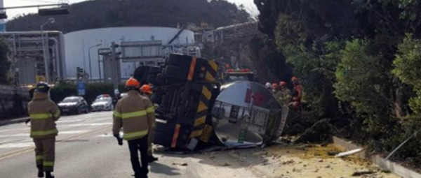 [글로벌이코노믹 온기동 기자] 15일 오전 11시20분경 전남 여수시 적량동에서 탱크로리와 트럭이 부딪혀 탱크로리가 전복되는 사고가 발생했다.