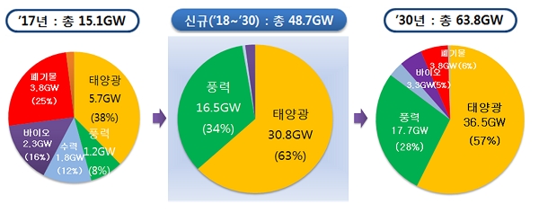 정부는 2030년까지 재생에너지 설비용량을 63.8GW로 확대할 계획이다. 발전원별로는 태양광이 36.5GW, 풍력이 17.7GW, 바이오 3.3GW, 폐기물 3.8GW 등이다.