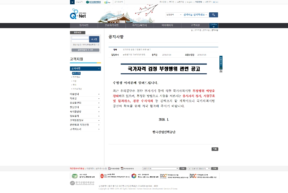 산업인력공단이 이 같은 공고를 낸 것은 전날 2018년 기술사 제114회 필기시험 원서접수 공고를 냈기 때문으로 풀이된다. 올해도 국가자격 검정이 시작되면서 부정행위에 대한 경고를 낸 것.