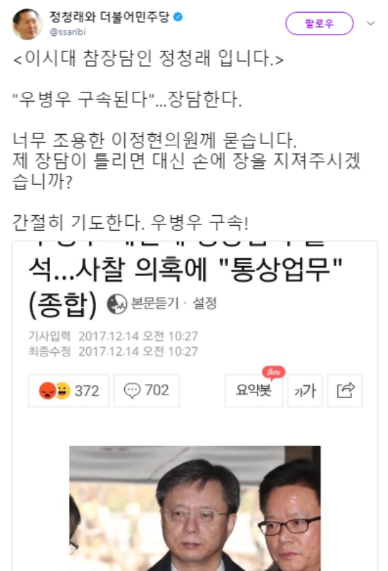 이미지 확대보기지난해 정청래 전 더불어민주당 국회의원은 자신의 트위터에 “이시대 참장담인 정청래 입니다”라는 말로 운을 뗐다. 이어 그는 “우병우 구속된다... 장담한다. 너무 조용한 이정현의원께 묻습니다. 제 장담이 틀리면 대신 손에 장을 지져주시겠습니까? 간절히 기도한다. 우병우 구속!“”이라는 글을 게재했다.