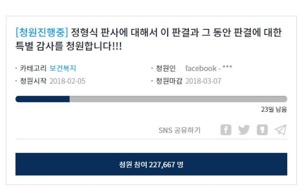 이미지 확대보기정형식 판사에 대한 청와대 국민청원이 22만 명을 돌파해 정부 대답 요건을 충족했다.