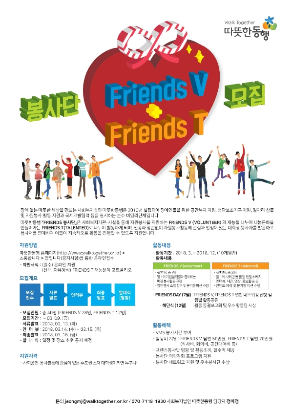 따뜻한동행은 오는 3월 9일까지 사회복지기관과 시설에서 자원봉사를 하는 ‘프랜즈V’와 글쓰기, 사진 등 재능을 기부하는 ‘프랜즈T’를 각각 모집한다고 27일 밝혔다.
