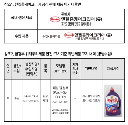 이어 "환경부에서 발표한 퍼실 겔 컬러 제품은 병행 수입 업체에서 수입한 제품"이라며 "헨켈홈케어코리아에서 공식 판매하는 제품과는 관련이 없으므로 혼돈 없으시길 바란다"고 덧붙였다.