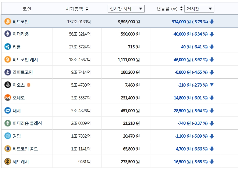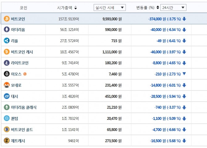 또 비트코인 캐시 111만원, 라이트코인 17만8500원, 대시 45만5000원, 모네로 23만3300원, 이오스 7420원, 이더리움 클래식 2만1270원, 재트캐시 27만1500원이다.