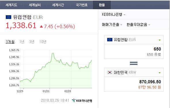 650유로는 26일 오후 6시 40분 기준 한화로 약 87만96원이다. 오늘 오전 10시 30분보다 1230원이 올랐다. 1유로당 1337.88원을 적용했다.