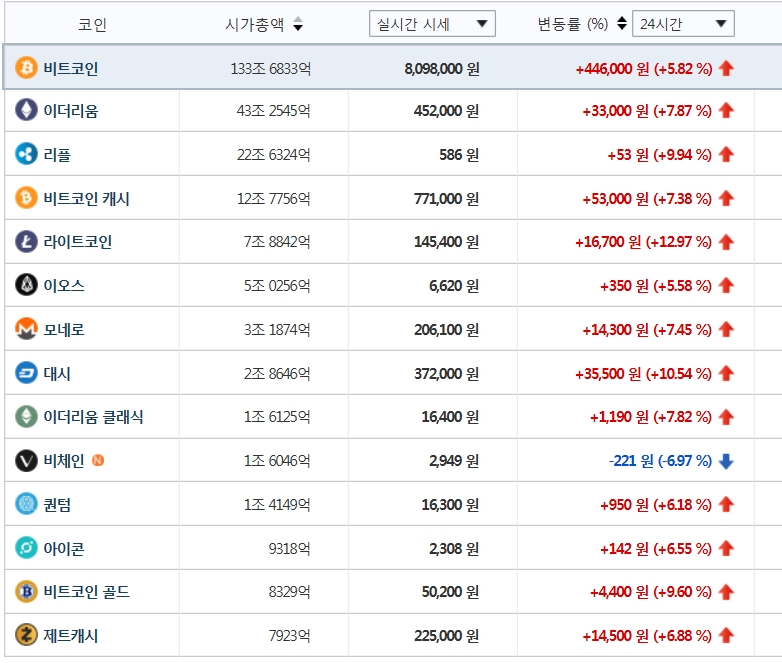 또 비트코인 캐시 77만 2000원, 라이트코인 17만8500원, 대시 37만6000원, 모네로 20만7300원, 이오스 6650원, 이더리움 클래식 1만6770원, 재트캐시 22만5000원이다.