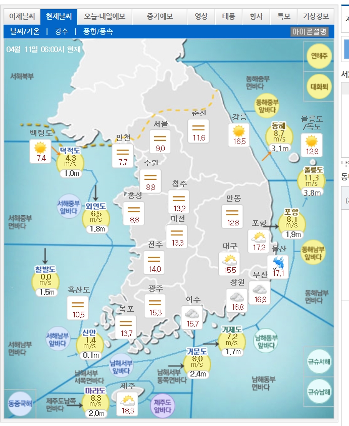 이미지 확대보기수요일인 11일은 전국이 흐리고 비가 오겠으며 중부지방은 새벽에 남부지방은 아침에 대부분 그치겠다. 오후부터는 맑은 하늘을 볼수 있을 것으로 보인다.