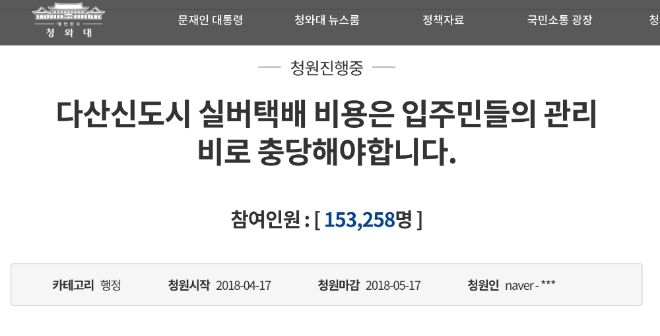 18일 6시 23분 현재 15만3258명이 동의한다는 뜻을 나타냈다. “자기 택배는 자기 돈으로 받으세요. 당연한 거 아닌가요?”, “세금을 이렇게 사용되면 안 됩니다” 따위의 댓글이 달렸다. 한 달 안에 청와대 국민청원에 20만명 이상이 동의 의사를 표시하면 청와대 수석비서관이나 해당 부처 장관이 공식 답변을 내놔야 한다.