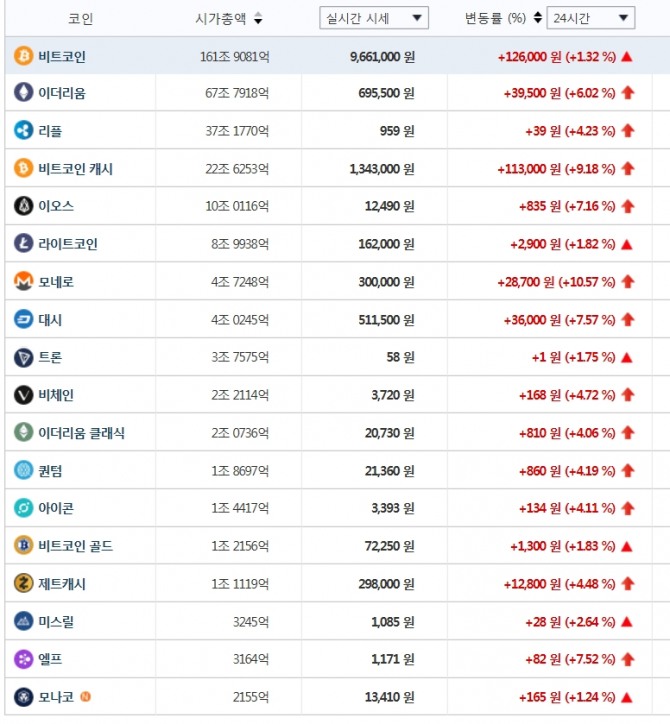 또 비트코인 캐시 134 2000원, 라이트코인 16 3500원, 대시 50만9000원, 모네로 29만8300원, 이오스 1만2050원, 이더리움 클래식 2만9270원, 재트캐시 29만9000원, 모나코 1만 3800원이다.