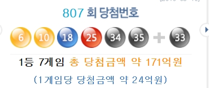 1등 2명은 '자동', 5명은 '수동'이며 같은 번호를 2번 기입한 사람은 없었다. 1등은 7명으로 26억 4000 만원 씩 수령한다.전국 7곳서 대박을 터뜨렸다.