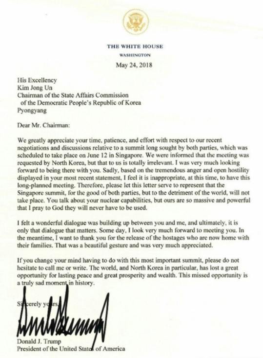 트럼프 대통령은 이날 백악관을 통해 김정은 북한 국무위원장에게 쓴 공개서한에서 “역사적인 북미정상회담은 북한의 '엄청난 분노와 노골적인 적개심' 때문에 "적절치 않다"며 이같이 밝혔다.