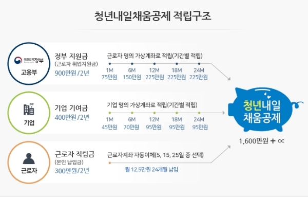 청년 본인이 2년간 300만원(매월 12만 5천원)을 적립하면 정부(취업지원금 900만원)와 기업(400만원, 정부지원)이 공동 적립된다.