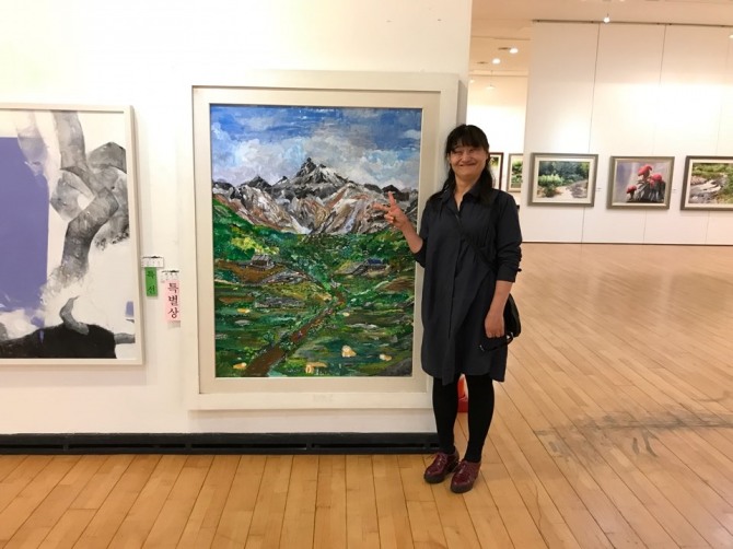 박선진 작가는 “평소 등산을 좋아해서 산을 그리는 것을 좋아하는데 60호라는 대작을 완성했을 뿐 아니라 대회에서 수상하게 되어 지도해주신 선생님과 지지와 격려를 해준 회원들에게 감사를 전한다.”고 소감을 전했다.
