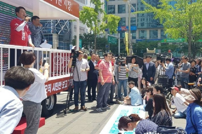 이미지 확대보기권 후보는 지난 11일 오후 3시 대구텍스타일콤플렉스에서 열린 자유한국당 대구시당 필승 결의대회에 참석했다. 권 후보는 행사장 앞에서 대구시립희망원 폐쇄 및 탈시설 등 장애인 정책 협약을 요구하며 피켓팅을 420장애인차별철폐대구투쟁연대 회원들과 만났다.