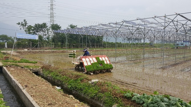 내용에 따르면 이미 한국남동발전은 지난해 6월 국내 최초로 농업과 신재생에너지가 공존하는 ‘100kW급 계통연계형 영농형 태양광발전’을 경남 고성군 하이면 일대 농지 2,480㎡(약750평)에 준공, 9월 추수행사를 시행한 바 있다.