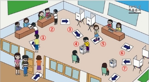 투표절차는 ① 본인여부 확인(신분증 제시) ② 투표용지 3장 수령(세종시 4장/ 제주도 2장, 재•보궐선거지역 4장) ③ 기표(인주가 들어있는 기표용구 사용) ④ 투표함 투입 ⑤ 투표용지 4장 수령(세종시 없음/ 제주도 3장) ⑥ 기표(인주가 들어있는 기표용구 사용) ⑦ 투표함 투입 순으로 이뤄진다.