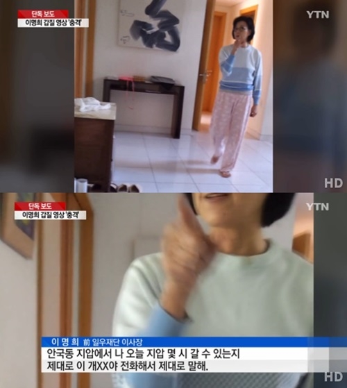영상 속 이명희 전 이사장은 방에서 나와 수행기사를 보자마자 지압 일정을 확인하라고 지시하며 "개XX야 전화해서 제대로 말해"라고 욕설을 퍼부었다. 이 외에도 이 전 이사장은 "왜 넥타이 매고 XX이야" 등 생트집에 가까운 행패를 부리는 모습이다.